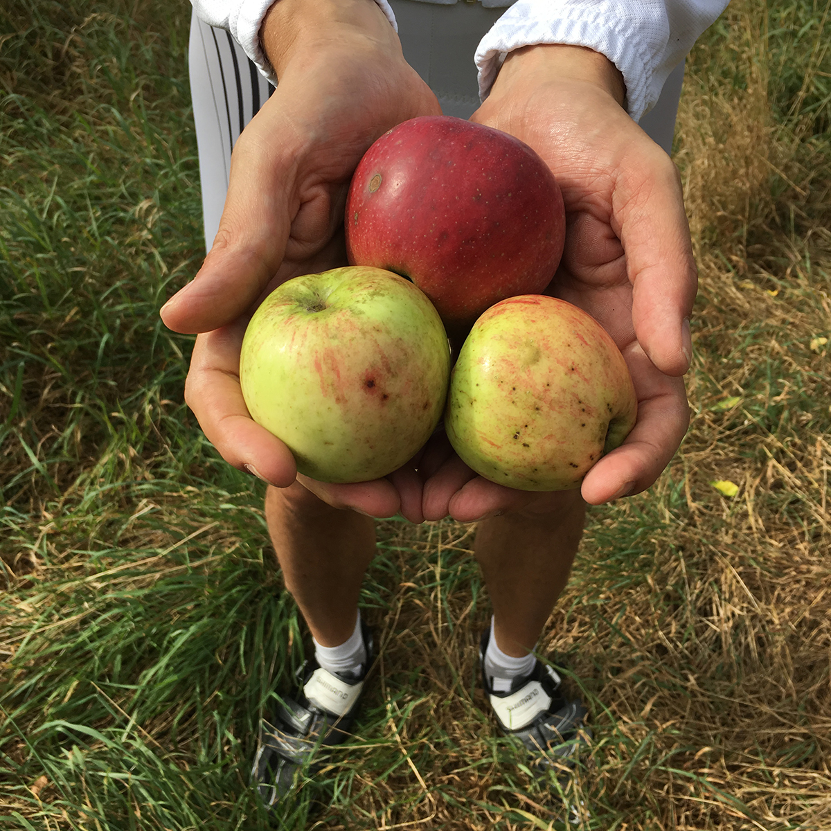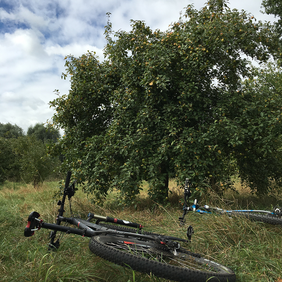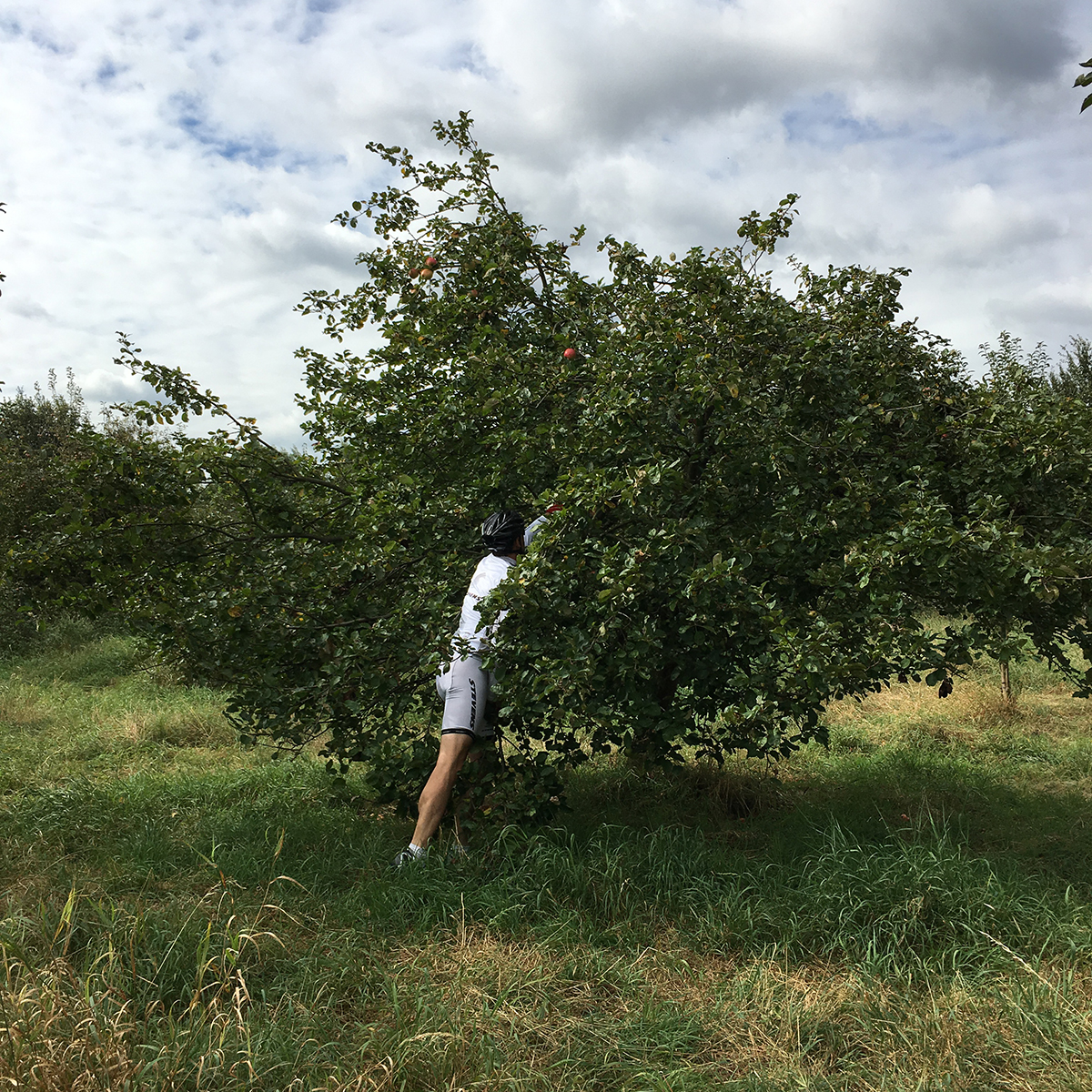 Auf einer kleinen Mountainbike-Tour durch ein wunderschönes Naturschutzgebiet am Rande Hamburgs sind wir heute auf dem Rückweg irgendwo zwischen Harburg und Wilhelmsburg an einer offensichtlich herrenlosen Apfelbaumwiese vorbeigekommen. Nun ja, nach knapp 50 km im Sattel hat sich dann angesichts der roten, grünen, gelben, kleinen und großen Äpfeln der Magen gemeldet… Also schnell anhalten, ein bisschen die Arme strecken und Äpfel direkt vom Baum pflücken und essen. Bei ein, zwei sind allerdings auch schon diverse Würmer auf die gleiche Idee gekommen, aber egal. Das sind halt echte Äpfel. Und so schmecken sie auch! Ein gutes Dutzend landet im Rucksack und zuhause gleich im Kochtopf, um frisches Apfelmark zu kochen. Denn morgen soll einer unserer Alltagsklassiker auf dem Frühstückstisch stehen: Overnight Oats in Apfelsaft mit Leinsamen, Mandeln, Quark, Himbeeren und Apfelmark. So einfach, so schnell, so lecker, so gesund.
