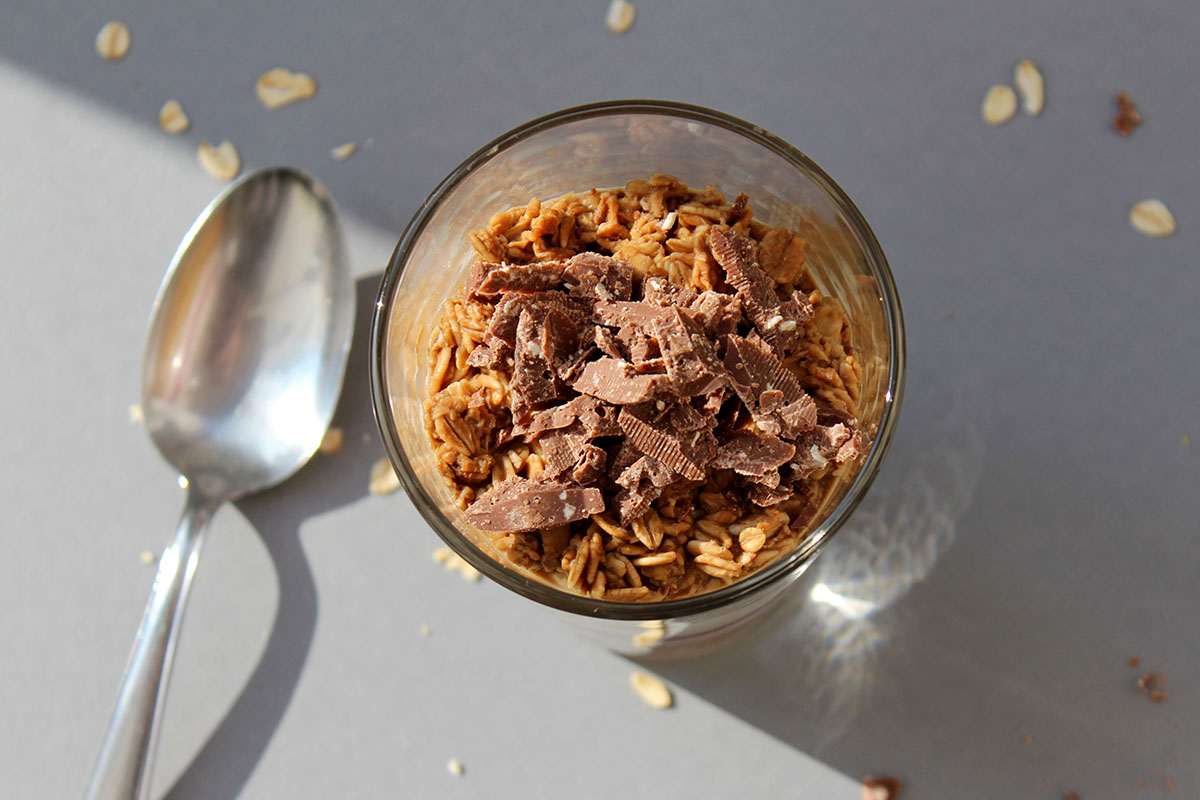 - Am Morgen 10 g Schokolade über die Oats hobeln.